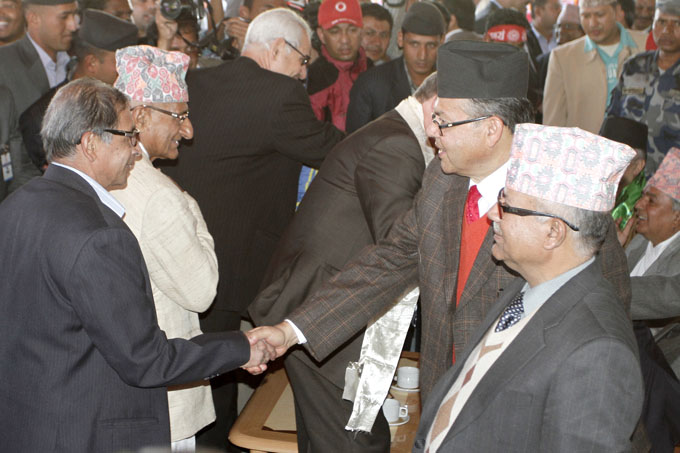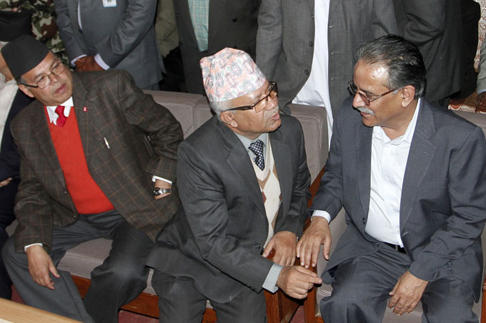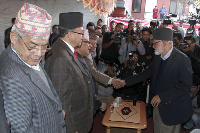 नेकपा (एमाले) वरिष्ठ नेता माधवकुमार नेपालले आज बिहान भएको दलहरूको बैठकमा आफूले निकासका लागि विभिन्न सात बुँदा प्रस्तुत गरेको जानकारी दिँदै जुनसुकै सहमति गरेमा पनि त्यसको कार्यान्वयनका लागि नयाँ सरकार गठन हुनुपर्ने विषय प्राथमिक भएको बताए। नेता नेपालले भने, ‘संविधानका विवादित विषयमा सहमति भएसम्मका आधारमा संविधान जारी गर्ने र सहमति नभएका विषयलाई पछि छलफल गर्दै जान सकिनेछ।’ उनले थपे, ‘राष्ट्रिय सहमतिको नयाँ सरकारले बजेट र निर्वाचन तयारी गर्ने विकल्प हामीले प्रस्तुत गर्यौं। विपक्षी दलहरुलाई अल्मल्याउने दउपेच गरेर यही सरकारबाट बजेट ल्याउने काम मान्य हुँदैन पनि भन्यौं।’ रासस प्रदीपराव वन्तले खिचेका तस्बिर हेर्नुस् :