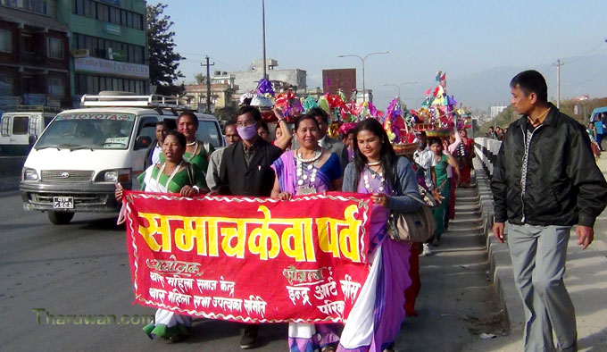 मदन चौधरी, काठमाडौं- थारु महिला सभा र थारु महिला समाजले संयुक्तरुपमा र्याली निकालेर सामा चकेवा पर्व मनाएका छन्। राजधानीको तिनकुनेबाट सुरु र्याली जडिबुटीस्थित मनोहरा खोलामा गएर टुंगिएको थियो। एक सय पचास जना सहभागी महिलाले डालामा सामा चकेवा बोकी नदीमा लगेर सेलाएका थिए। सामा चकेवा दिदीभाइबीचको प्रेमलाई प्रगाढ बनाउने पर्वको रुपमा लिइन्छ। सामा चकेवबारे विस्तृत पढ्न यहाँ क्लिक गर्नुहोस् :