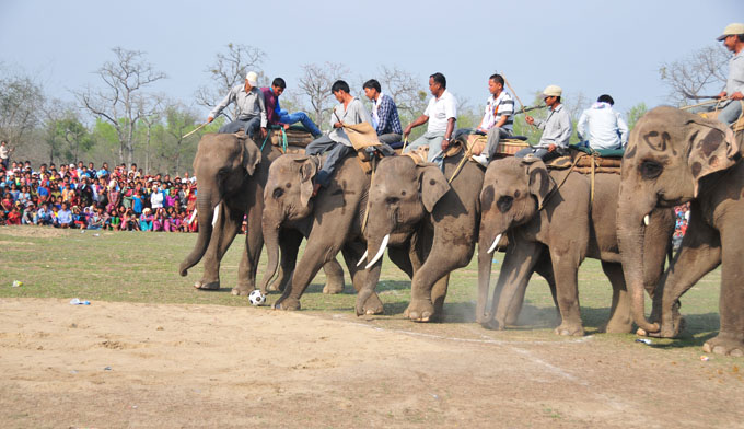 हामी पनि गैंडा खोज्न निस्केका। दुई घन्टा डुलिसक्दा पनि देखिएन। बरु जंगली हात्तीले हाँगाबिँगा भाँचेको आवाज सुनियो। त्यतै लाग्यौं। सुस्तरी आवाज पच्छयायौं। पर हात्तीको हुल देखियो। हात्तीले आक्रमण गर्न सक्छ। मनभित्रको डरलाई फोटो खिच्ने लोभले जित्यो। मोहन र वन कर्मचारी यतै बसे। हामी गाइड पछि लाग्यौं। करिब २५ मिटर दुरीबाट रुखको छेल परेर तस्बिर खिचें। जंगलभित्र फोटो राम्रो आएन तर, नजिकैबाट हात्ती हेर्न पाउँदा ठूलै बाजी जिते झैं भयो।