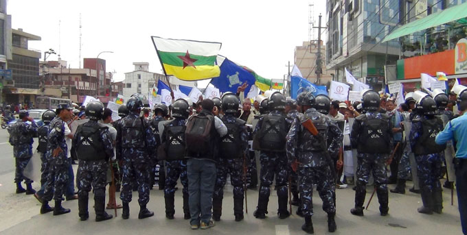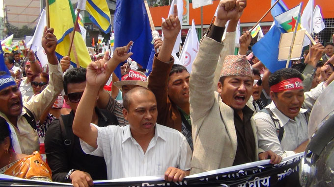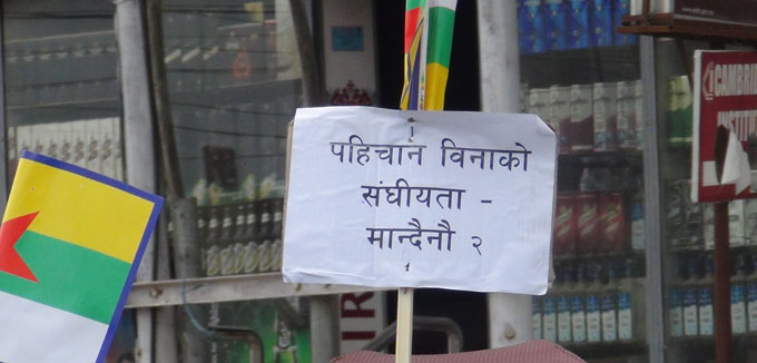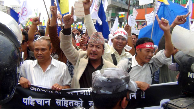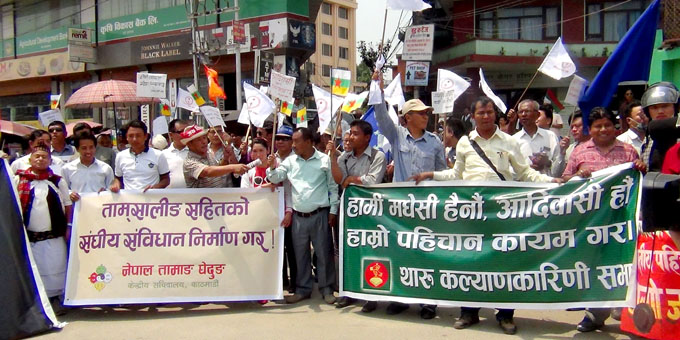 काठमाडौं- आदिवासी जनजाति महासंघले पहिचानसहितको संघीयता माग गर्दै नयाँ बानेश्वरमा प्रदर्शन गरेको छ। संविधान सभामा संघीय संरचनाबारे बहस भइरहँदा आदिवासी जनजातिको पहिचान मेटाउने प्रयास गरेको भन्दै महासंघले शुक्रबार र्यालीसहि प्रदर्शन गरेको हो। महासंघका अध्यक्ष नागेन्द्र कुमार कुमालले आदिवासी जनजातिको पहिचानलाई मेटाउने प्रायस गरेको भन्दै प्रदर्शन गरेको बताए। उनले हाम्रो पहिचानलाई मेटाउने खोजे आन्दोलन चर्काउने बताए। ‘संविधान सभा सदस्यहरुलाई ध्यानाकर्षणका निम्ति हामीले यो प्रदर्शन आयोजना गरेका हौं। हाम्रो पहिचानलाई मेटाउन खोजे आन्दोलन चर्काउँछौं,’ उनले भने।