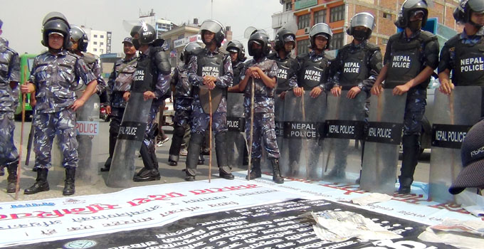 र्यालीलाई प्रहरीले नयाँ बानेश्वर चोकमा घेरेको थियो। मदन चौधरीले खिचेका केही तस्बिर हेर्नुस्:
