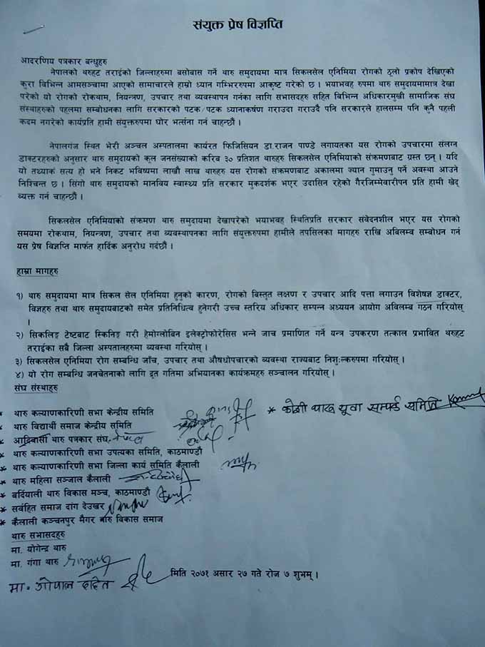 उपत्यकामा रहेका थारु संघ संस्थाहरुले संयुक्तरुपमा शुक्रबार विज्ञप्ती प्रकाशन गरी सिकलसेल रोकथामका लागि सरकारको ध्यानाकर्षण गराएका छन्। रोगको पहिचान, उपचार र निदानका लागि सरकारले यसै आर्थिकवर्षदेखि उचित बजेटको व्यवस्था गर्नुपर्ने माग विज्ञप्तीमा गरिएको छ। पश्चिम नेपालको नवलपरासी, कपिलवस्तु, रुपन्देही, बाँके, बर्दिया, कैलाली, कञ्चनपुर, सुर्खेत र दाङ् जिल्लामा यो रोगको संक्रमण देखिएको छ।
