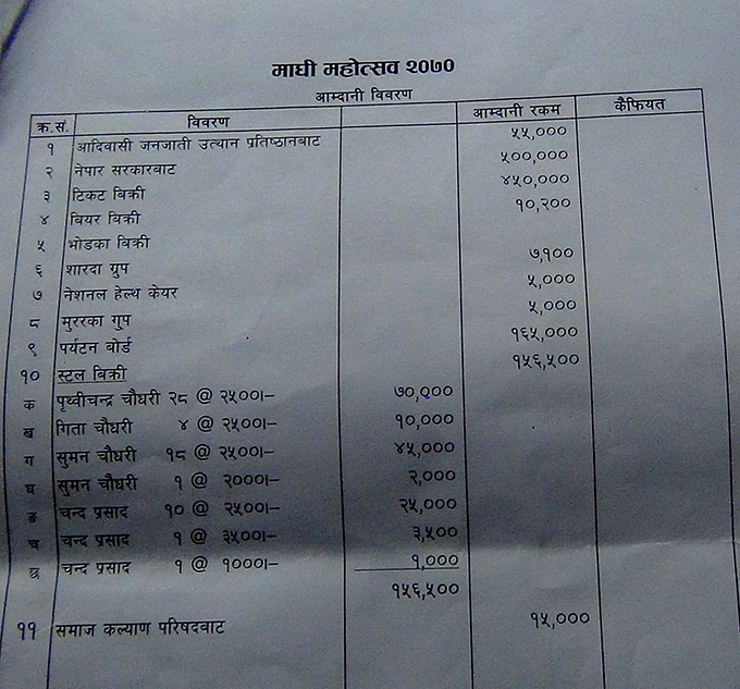 नेपाल सरकारले पाँच लाख, पर्यटन बोर्डबाट एक लाख ६५ हजार, ६३ वटा स्टल बिक्रीबाट १ लाख ५६ हजार ५ सय आम्दानी भएको देखिन्छ। त्यस्तै ११ हजार २ सय टिकट बिक्री गरेर ४ लाख ५० हजार रकम आएको विवरणमा उल्लेख छ। त्यस्तै आदिवासी जनजाति महासंघबाट ५५ हजार आएको देखिन्छ।