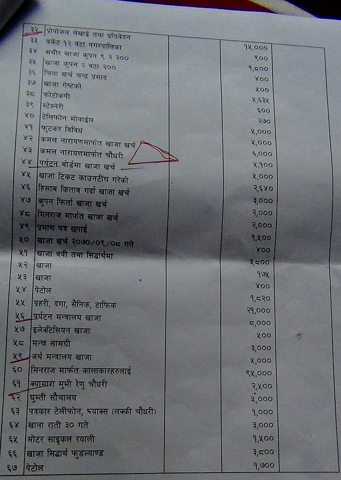 त्यस्तै टेन्ट, स्टेज, कुर्सी, टेबल खर्च २ लाख ५५ हजार २५ रुपियाँ देखिएको छ भने साउन्ड सिस्टमको १ लाख २५ हजार देखिइएको छ। जेनेटर भाडा पनि ५० हजार ५ सय ३० रुपियाँ देखिएको छ। पर्यटन बोर्डबाट आएको १ लाख ६५ हजार रकम उसैमार्फत् सबै खर्च भएको देखिएको छ। विवरणमा ब्यानर लेखाइ र ब्रोसर छपाइको ५० हजार ६ सय ५० रुपियाँ खर्च भएको देखिन्छ। जबकि ती दुई शीर्षकमा पर्यटन बोर्ड आफैंले खर्च गर्दै आएको छ।