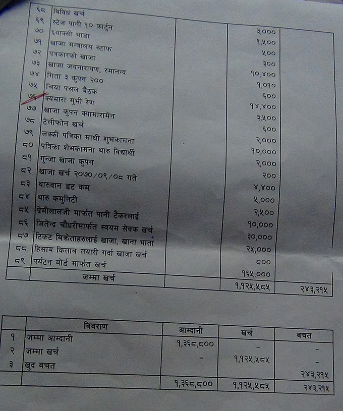 गत शनिबार मूल आयोजक समितिले पुरानो बानेश्वरस्थित थारु कल्याणकारिणी सभाको केन्द्रीय कार्यलयमा महोत्सवको सात महिनापछि खर्च विवरण सार्वजनिक गर्यो । खर्च विवरणअनुसार सबैभन्दा बढी खर्च ‘खाजा’मा गरेको देखिएको छ। खाजामा मात्र एक लाख ७० हजार रुपियाँ खर्च देखिएको छ। यो खर्च विभिन्न शीर्षकमा देखाइएको छ। सबैभन्दा धेरै स्वयंसेवकलाई ३० हजार खर्च देखिएको छ। त्यस्तै पत्रकारहरुलाई २७ हजार पाँच सय, अतिथि तथा प्रमुख अतिथिहरुलाई १७ हजार पाँच सय खर्च देखिएको छ। अन्य ब्यक्तिको नामबाट पनि खाजा खर्च देखिएको छ।