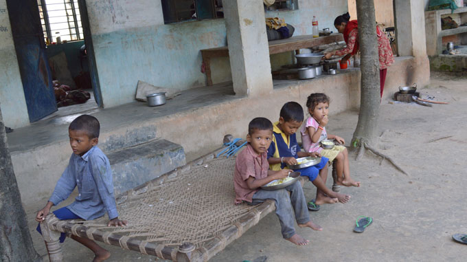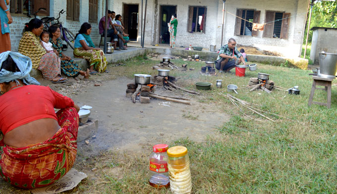 नजिकैको स्कुलको शिविरमा बसेका बाढी विस्थापित बिहानीको खाना बनाउँदै।