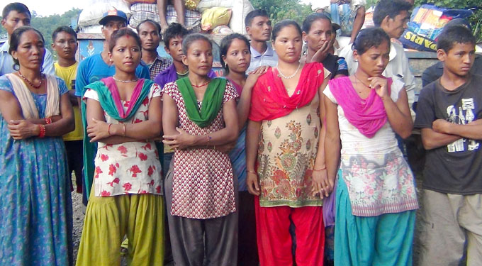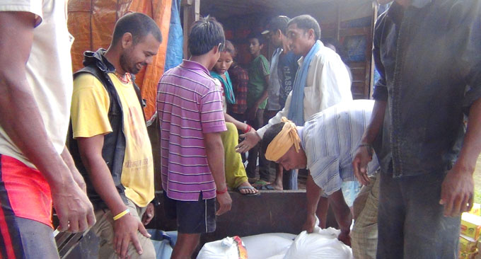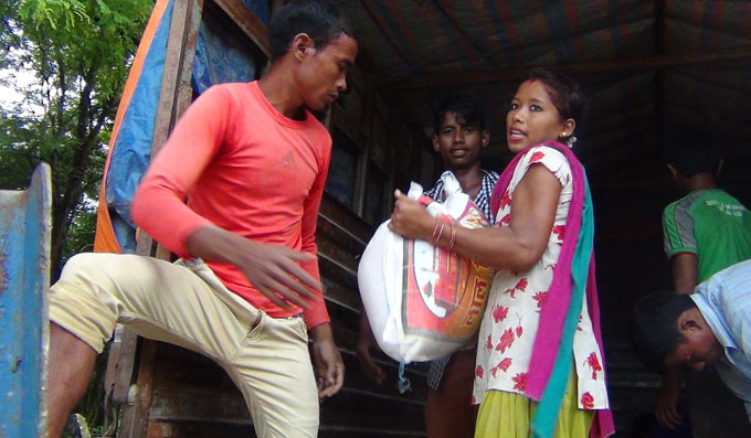 थारु युवाहरुले लगेको राहत ट्याक्टरमा हाल्दै बानियभारबा बाढीपीडित।