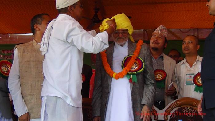 प्रधानमन्त्री कोइरालालाई पगरी बाँधदिँदै चन्द्रकुमार  चौधरी।