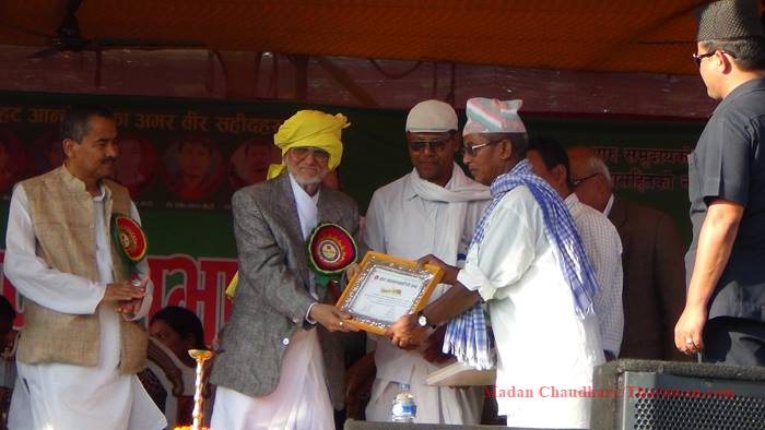 थारु सहिदका परिवारका सदस्यलाई सम्मान गर्दै प्रधानमन्त्री।