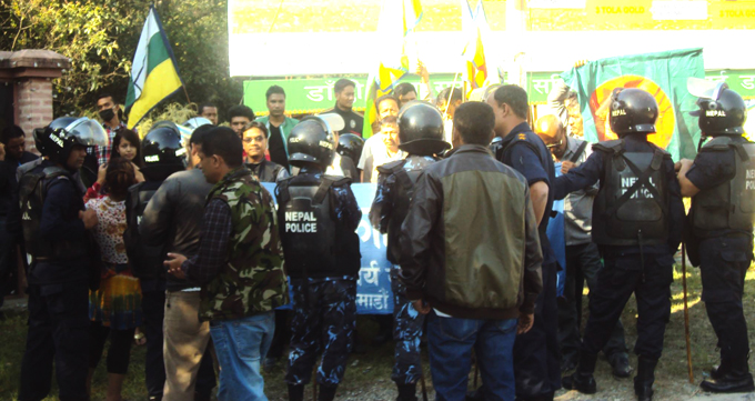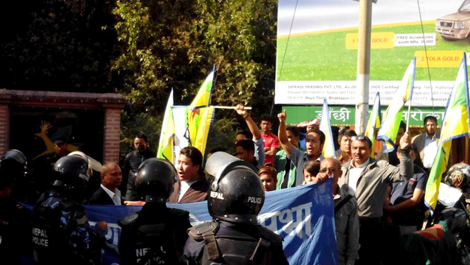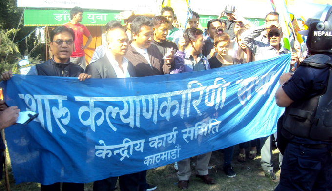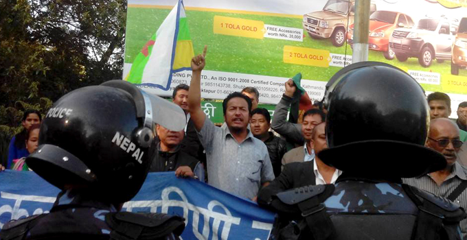 रिसोर्ट अगाडि प्रदर्शन गर्दै थारु तथा आदिवासी जनजाति नेताहरुले संविधानसभाको अवज्ञा नगर्न र तराईमा बहुप्रदेश बनाउन माग गरेका छन्।