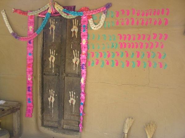 At day, Tharu women cook Bagiya and offer it to Har and Kodali (the tools) and worship. In the evening, they make a HukeHuka of Santhi (Tharu: सन्ठी] (processed stem of jute) and tie it up with labaka bahrani (new Bahrani grass). It is made a plus with Santhi on the head of HukeHuka to put a Diyo. They put a HukeHuka on each roof of houses, gahali [Tharu: गाहली] (cowshed), khor [Tharu:खोर] (pen) and at bari (garden) or at DhanKhet (paddy field). It is supposed a good sign. In the eve a Diyo is lit at the Devghar. One main diyo is lit in the main gate of devghar. With the help of this diyo some other diyos are lit inside and outside of houses. One member of each family lights HukeHuka up with the main diyo. He/she reads a spell, “Daridra bahar ho, Laxmi ghar dhuk” by revolving around the house yard in clockwise. It means he/she is inviting the goddess of wealth (here Laxmi) to enter in their houses for prosperity and on the other hand, they are chasing poverty [Tharu: दरिद्र] with the fire of HukeHuka. Thereafter a member from each door of a village comes out in the playground with HukeHuka. They throw it in the sky shouting ‘HukeHuka’. They gather the remains of HukeHuka at middle of the playground. They commence skipping/jumping over the burning hukehuka. After putting the fire off hukehuka, they take some pieces of it to their houses and put it at vegetable garden. It is believed if they put it at their garden, the land becomes fertile and vegetables grow well. Likewise, he carries one hukehuka and a diyo to their paddy field. He stands the hukehuka on the middle bracket [Tharu: आली] and enlightens diyo. He reads a spell loudly, ‘Hamar Dhan Shair Ho’ [Tharu: हमर धान शैर हो]. It means he wishes his paddy would become healthy and grow or ripen well. Besides, the head of family members or a representative worships a cow, cereals, property and money in the evening. A female member makes a pattern in front of the main gate of her house. The pattern [Tharu: रंगोली] is made up of different color of sand/powder or flower petals. In the middle of the pattern, a diyo is lit. She invites deities (especially the goddess of wealth) through the pattern.