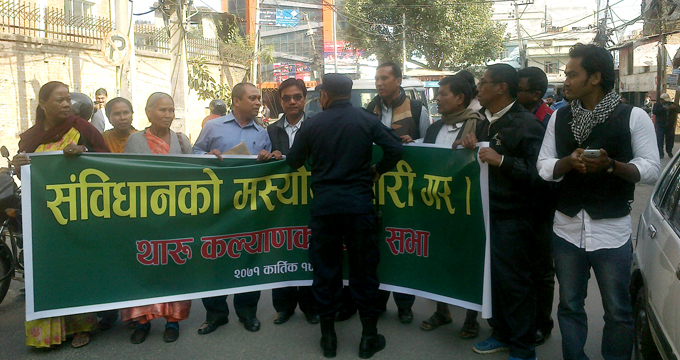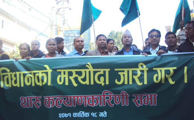 तीन पार्टीको गोकर्ण रिसोर्ट वैठक विरुद्ध त्यहिँ पुगेर विरोध प्रदर्शन गरेको थारु कल्याणकारिणी सभाले आज फेरि काठमाडौंमा ‘दिने भए मस्यौदा दे, नत्र राजिनामा दे’ भन्दै प्रदर्शन गरेको छ। थारु कल्याणकारिणी सभाको प्रदर्शमा संघीय लोकतान्त्रिक राष्ट्रिय मञ्च (थरुहट) की सभासद रुकमिणी चौधरी संवैधानिक राजनीतिक संवाद तथा सहमति समितिको चल्दाचल्दैको वैठक छाडेर उनी प्रदर्शनमा सहभागी भएकी थिइन्।