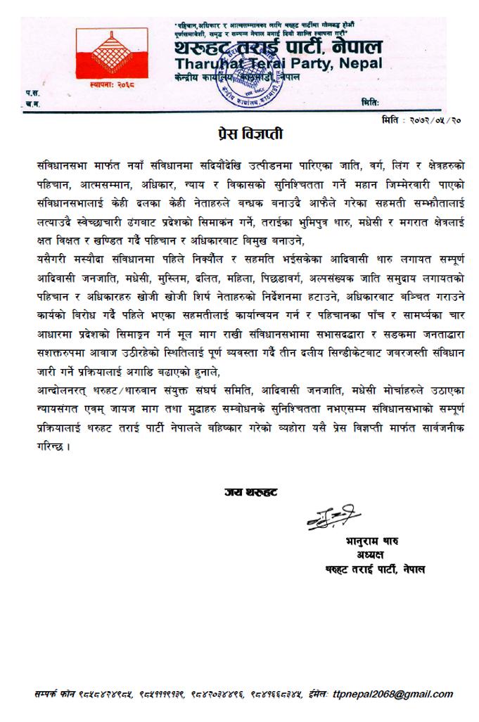 फोरम लोकतान्त्रिकका अध्यक्ष विजय गच्छदार नेतृत्वको संघीय लोकतान्त्रिक मोर्चासँगै थारु सभासदहरु संविधानसभाको जारी प्रक्रियाबाट बाहिरिने भएका छन्। भानुराम चौधरी नेतृत्वको थरुहट तराई पार्टी र रुक्मिणी चौधरी नेतृत्वको संघीय लोकतान्त्रिक राष्ट्रिय मञ्च (थरुहट) पनि संविधानसभाबाट बाहिरिने भएका हुन्।