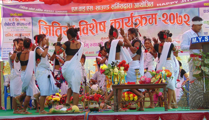 राईका महिलाहरुको महान पर्व जितिया असोज कृष्णपक्षको अष्टमी तिथिका दिन तराईका महिलाहरुले धुमधामका साथ मनाएका छन्। सप्तमी तिथिबाट शुरु भएको जितिया सप्तमीको राती डट्खट् खाएर अष्टमीमा निराहार ब्रत बसेर जितिया मनाएका हुन्। अष्टमीका दिन चितवनका ब्रतालुहरु थारु महिलाहरु बिहानै नुहाएर बेलको पातहरु टिप्न गए। त्यहाँ बेलको बोट वरिपरि झम्टा नृत्य प्रस्तुत गरे।