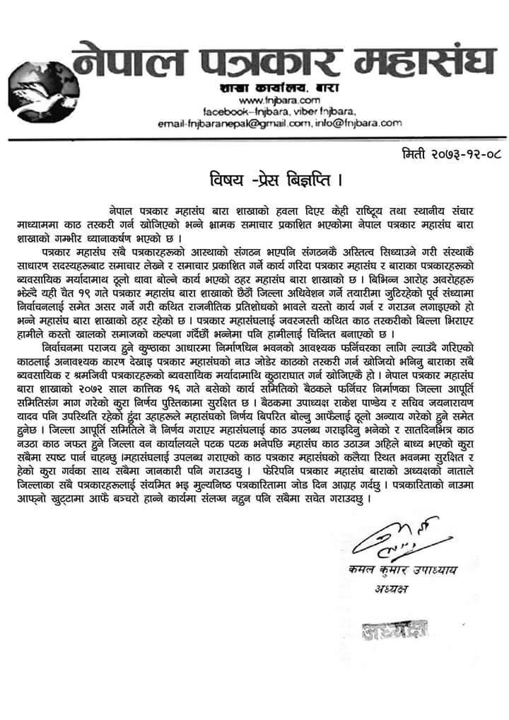 पत्रकार महासंघ बारा शाखामा ‘काठ’ राजनीति, अध्यक्षले भने, ‘श्रमजीवी पत्रकारको मर्यादामाथि कुठाराघात’