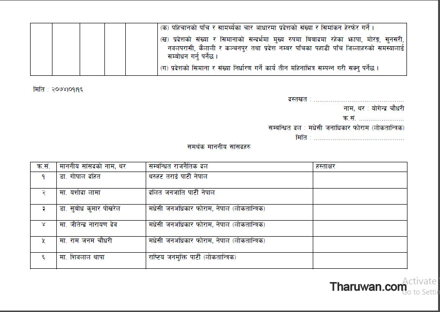 फोरम लोकतान्त्रिकका प्रमुख सचेतक योगेन्द्र चौधरीले संशोधन प्रस्ताव दर्ता गराएका छन्। उनले थरुहट तराई पार्टी नेपालका गोपाल दहित, दलित जनजाति पार्टी नेपालकी यशोदा लामा र राष्ट्रिय जनमुक्ति पार्टी लोकतान्त्रिकका शिवलाल थापा र फोरम लोकतान्त्रिककै रामजनम चौधरी, सुबोधकुमार प्याकुरेल र जितेन्द्र देव यादवको समर्थनमा संशोधन प्रस्ताव दर्ता गराएका हुन्।