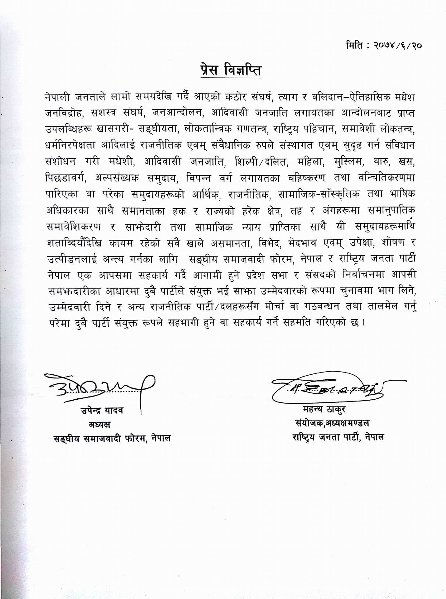 विज्ञप्तिमा भनिएको छ- ‘आगामी प्रदेश सभा र संसदको निर्वाचनमा आपसी समझदारीका आधारमा दुबै पार्टीले संयुक्त भाई साझा उम्मेदवारहरुको रुपमा चुनावमा भाग लिने,उम्मेदवारी दिने र अन्य राजनीतिक पार्टीहरुसँग मोर्चा वा गठबन्धन तथा तालमेल गर्नु परेमा दुबै पार्टी संयुक्त रुपमा सहभागी हुने वा सहाकार्य गर्ने सहमति गरिएको छ ।’
