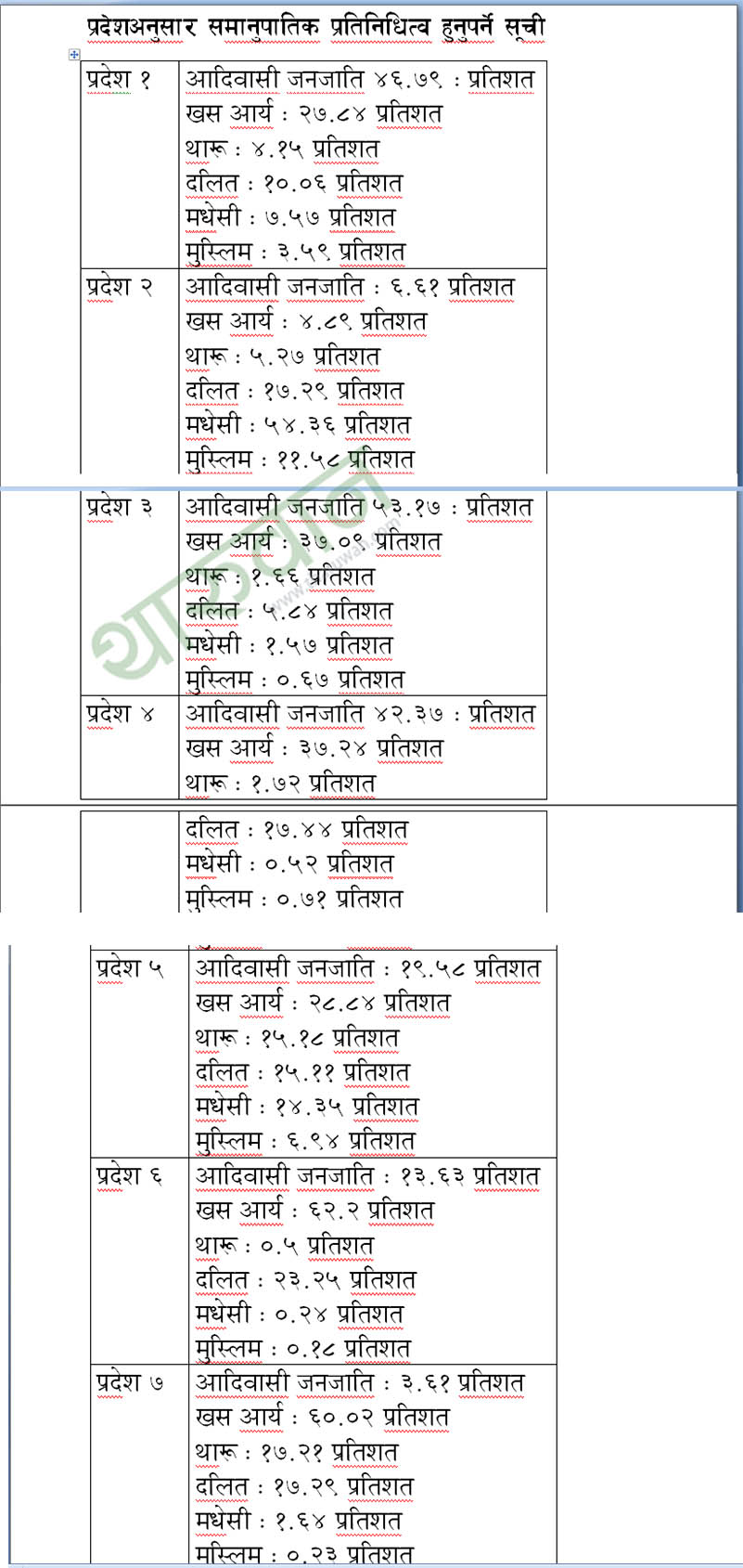 प्रदेश ५ मा आदिवासी जनजाति १९.५८, खस आर्य २८.८४, थारू १५.१८, दलित १५.११, मधेसी १४.३५, मुस्लिम ६.९४ प्रतिशत हुनुपर्नेछ ।