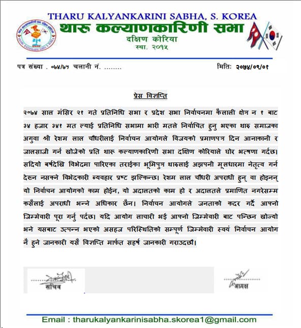 कोरियाका आदिवासी जनाजति महासंघ र थारु कल्याणकारी सभाले छुट्टा छुट्टै विज्ञप्ति निकालेर गत मंसिर २१ गते भएको निर्वाचनबाट कैलाली क्षेत्र नं। १ बाट निर्वाचित चौधरीलाई प्रमाणपत्र नदिएको भन्दै आपत्ति जनाएका हुन् । ती संस्थाहरुले विज्ञप्तिमार्फत चौधरीलाई तत्काल प्रमाण पत्र दिलाउन नेपाल सरकारलाई माग गरेका छन् ।