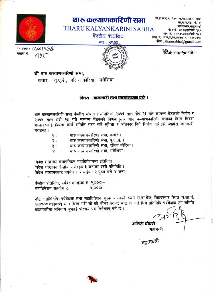 थारु कल्याणकारीणी सभा (थाकस)ले विदेश च्याप्टरलाई जिल्ला शाखाकैसरह मान्यता दिएको छ। भदौ २५ गते बसेको बैठकले विदेश च्याप्टरलाई उक्त मान्यता दिएको महामन्त्री अमिरी चौधरीद्वारा जारी विज्ञप्तीमा उल्लेख छ। तर बैठकको निर्णय हो खुलाइएको छैन।