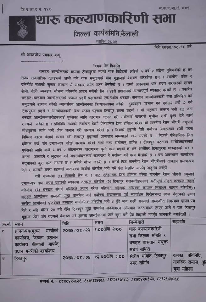 थारु कल्याणकारिणी सभा (थाकस) कैलालीले प्रतिनिधिसभा सदस्य रेशमलाल चौधरीलाई तत्काल प्रमाणपत्र र शपथ ग्रहण नगराइए मंसिर २३ गतेदेखि चरणवद्ध रुपमा आन्दोलन गर्ने चेतावनी दिएको छ । मंगलवार धनगढीमा पत्रकार सम्मेलन गरी आन्दोलनको कार्यक्रम समेत सार्वजनिक गर्दै थाकसले चेतावनी दिएको हो ।