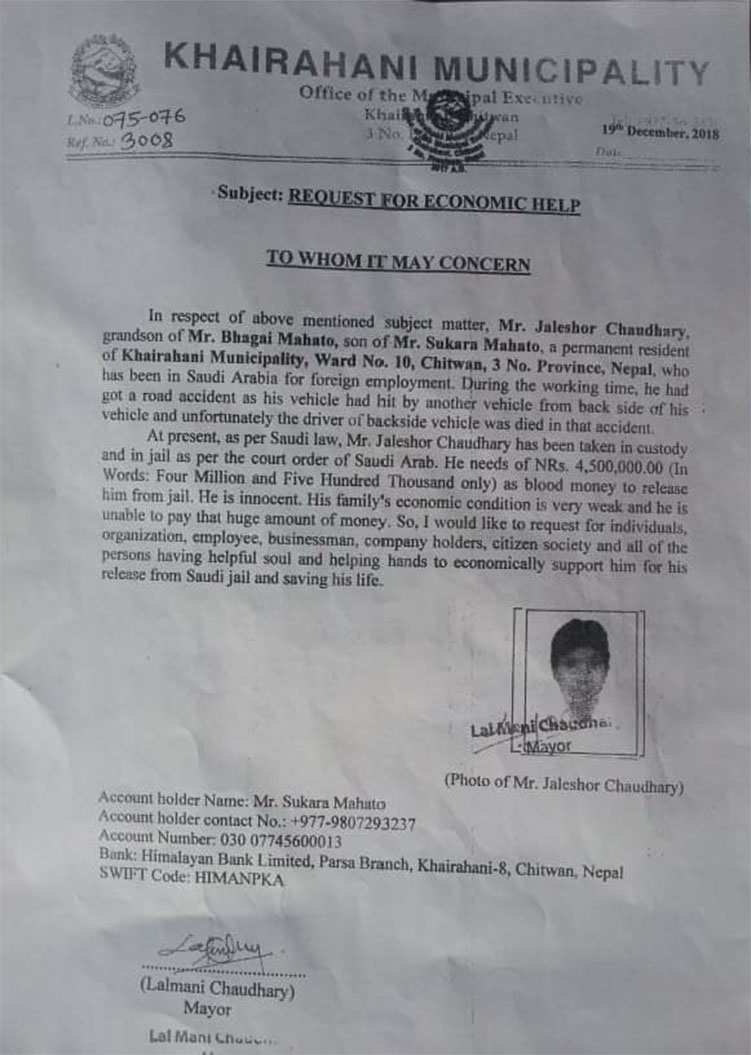 जलेश्वर चौधरी खैरहनी नगरपालिका वडा नं. १०, गोठौलीका सुकराम महतो र मलुई महतोका छोरा हुन् । उनी २५ वर्षीय युवा हुन् । ऊ चार वर्ष वर्षअघि वैदेशिक रोजगारका लागि साउदी अरब पुगेका थिए । साउदीमा ब्लक उत्पादन गर्ने रुफ कम्पनीको मिक्चर चलाउने काम गर्न थालेका थिए । साउदीमा एउटा दुर्घटना भयो । उनले चलाएको गाडीको पछाडिबाट एउटा कारले ठक्कर दिए । ठक्कर दिने कारचालकको मृत्यु भयो । घटना भएलगत्तै चौधरी जेलमा परे । दुई वर्ष जेल सजाय काटिसकेपछि मृतकका परिवारले माफी दिएपछि उनी जेलमुक्त भए । घर फर्किन ठीक्क परेका चौधरीलाई साउदी अदालतले एउटा फैसला सुनायो र उनी घर फर्किन सकेनन् । मृतकको आठ वर्षीय छोरा रहेको र उनको लालनपालनका लागि भन्दै साउदी अदालतले जलेश्वरसँग एक लाख ५० हजार रियल अर्थात् करिब ४५ लाख नेपाली रूपैयाँ माग गरेपछि स्वदेश फर्किने उनको सपना क्षणभरमै तुहियो । साउदी अदालतले ब्लडमनीको रुपमा चौधरीसँग सो रकम माग गरेको हो ।