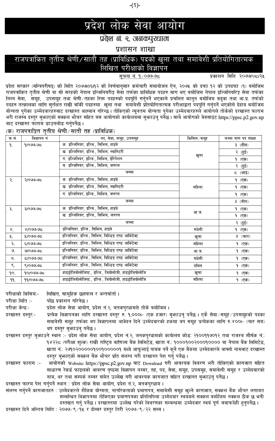 प्रदेश २ को लोकसेवा आयोगले पहिलो पटक प्राविधिकतर्फको रिक्त दरबन्दीका लागि दरखास्त आह्वान गरेको छ । आयोगले राजपत्रांकित तृतीय श्रेणी/सातौं तह (प्राविधिक) मा दरखास्त आह्वान गरेको हो । खुल्लातर्फ इन्जिनियरतर्फ सिभिल हाइवेमा ३ जना, सिभिल स्यानिटरीमा २, सिभिल इरिगेसनमा १ र सिभिल जनरल पदमा २ जनाको माग गरिएको छ ।