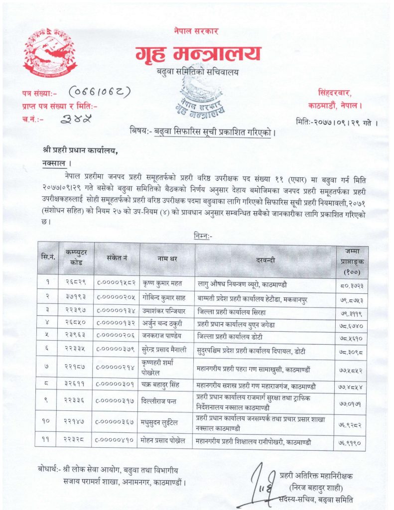 प्रहरी प्रधान कार्यालय, नक्सालले प्रकाशन गरेको सूची अनुसार कृष्णकुमार महत, गोविन्दकुमार शाह, उमाशंकर पञ्जियार, अर्जुन चन्द ठकुरी, जनकराज पाण्डेय, सुरेन्द्रप्रसाद मैनाली, कृष्णहरि शर्मा पोखरेल, चक्रबहादुर सिंह, दिल्लीराज पन्त, मधुसुधन लुइँटेल र मोहनप्रसाद पोखरेललाई एसएसपीमा बढुवा गर्न सिफारिस गरिएको छ ।