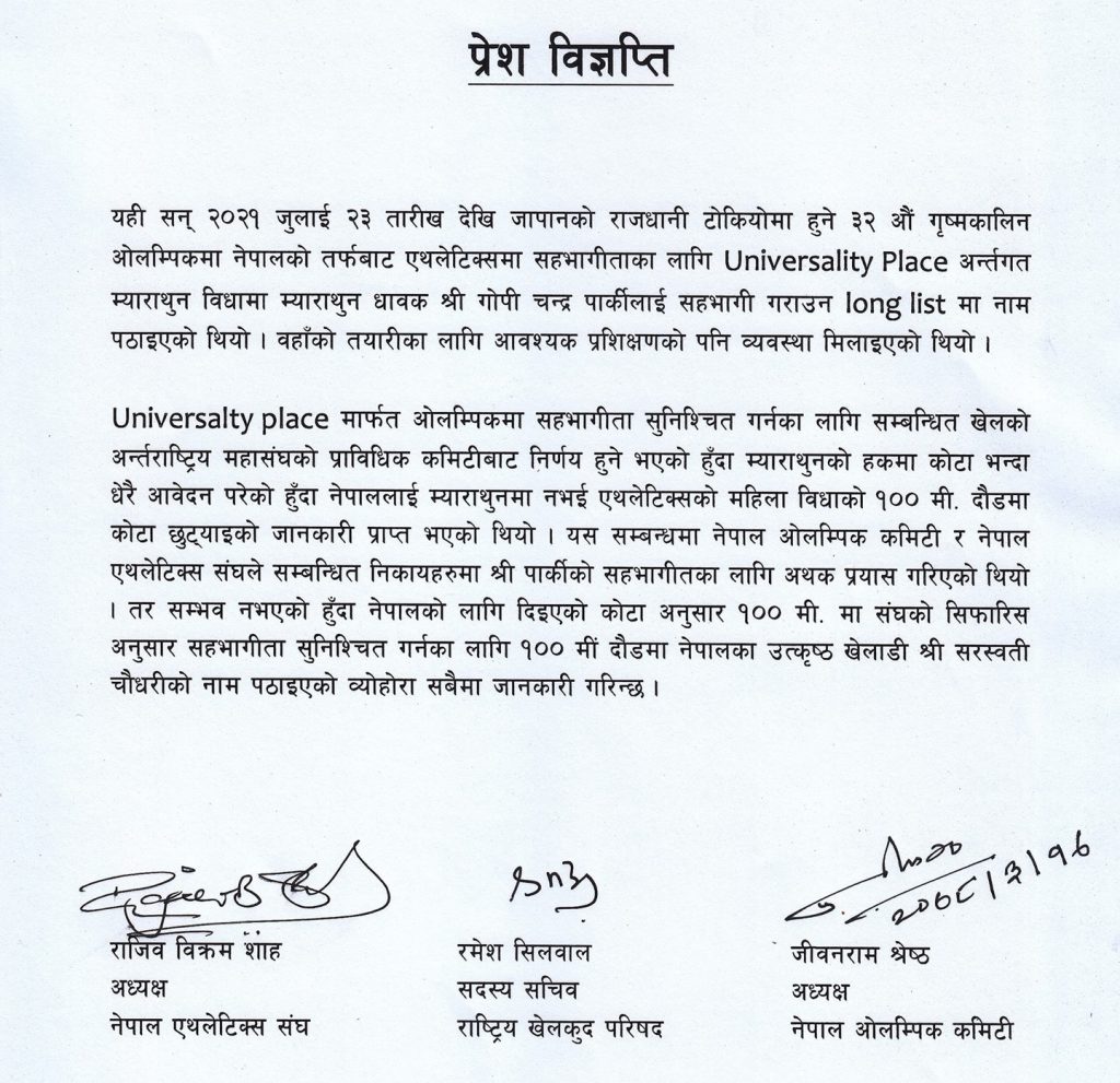 ‘युनिभर्सिटी प्लेसमार्फत ओलम्पिकमा सहभागिता सुनिश्चित गर्नका लागि सम्बन्धित खेलको अन्तर्राष्ट्रिय महासंघको प्राविधिक कमिटीबाट निर्णय हुने भएको हुँदा म्याराथनको हकमा कोटाभन्दा धेरै आवेदन परेको हुँदा नेपाललाई म्याराथनमा नभई एथ्लेटिक्स विधाको १०० मिटर दौडमा कोटा छुट्याइएको जानकारी प्राप्त भयो। यस सम्बन्धमा नेपाल ओलम्पिक कमिटी र नेपाल एथ्लेटिक्स संघबाट सम्बन्धित निकायहरुमा पार्कीको सहभागिताको लागि अथक प्रयास गरिएको थियो । तर सम्भव नभएको हुँदा नेपालका लागि कोटा अनुसार १०० मिटर दौडमा संघको सिफारिस अनुसार सहभागिता सुनिश्चित गर्नका लागि नेपालकी उत्कृष्ट खेलाडी सरस्वती चौधरीको नाम पठाइएको व्यहोरा जानकारी गराइन्छ,’ विज्ञप्तिमा भनिएको छ।