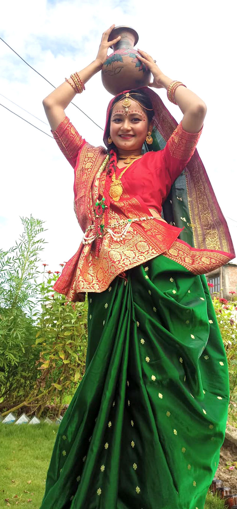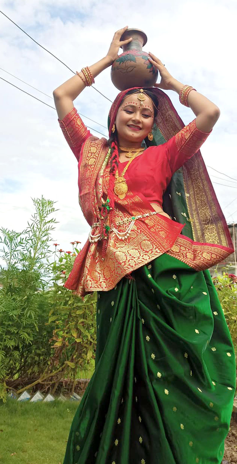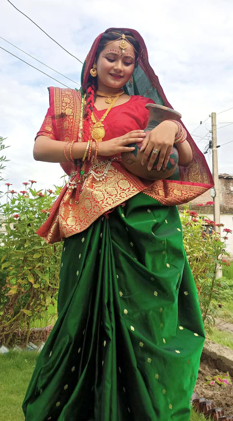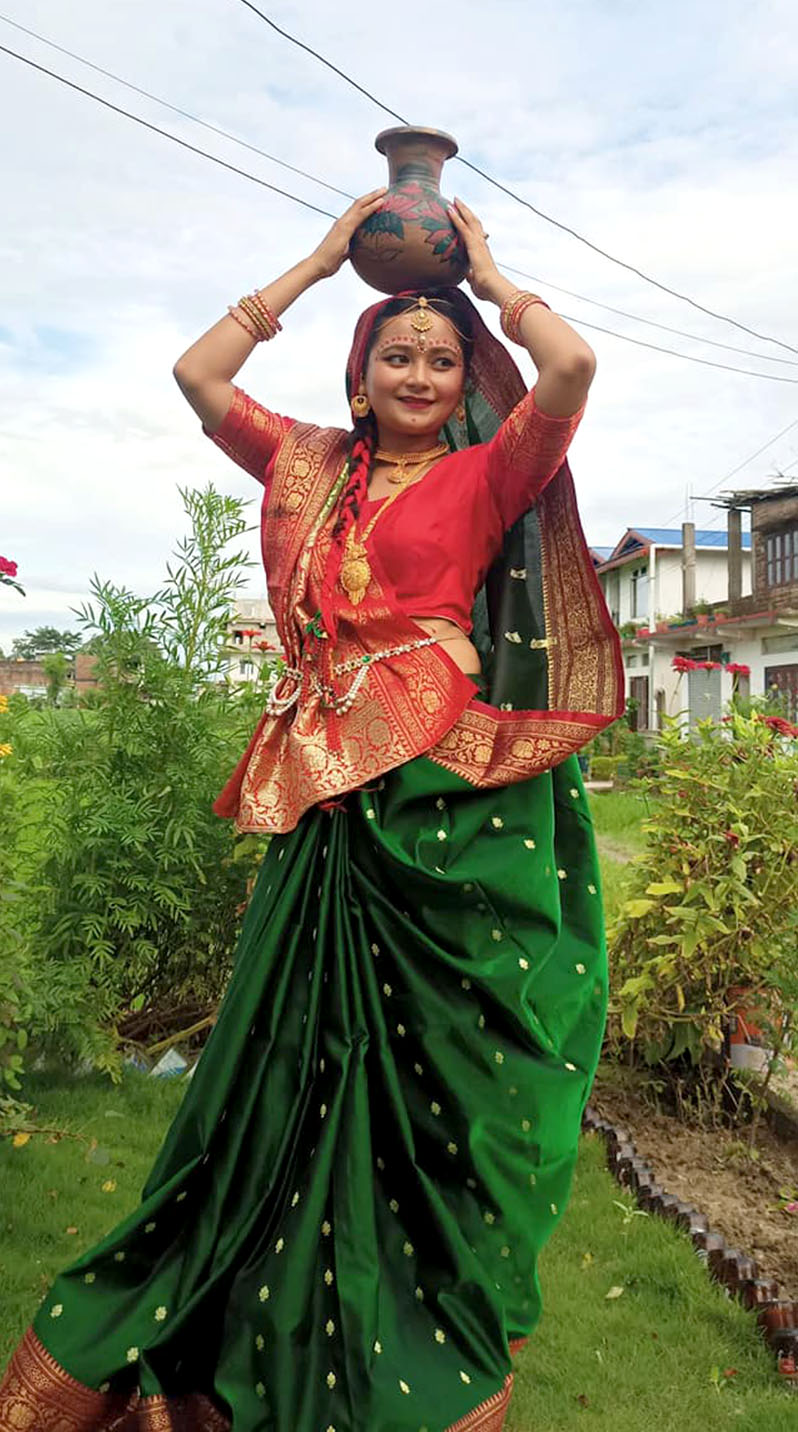 उनै मोडेलले फेसबुकमा सारीसहितको तस्बिर सार्वजनिक गरेकी छन्। घैँटो बोकेर विभिन्न पोजका तस्बिरहरु पोष्ट्याएका छन्।