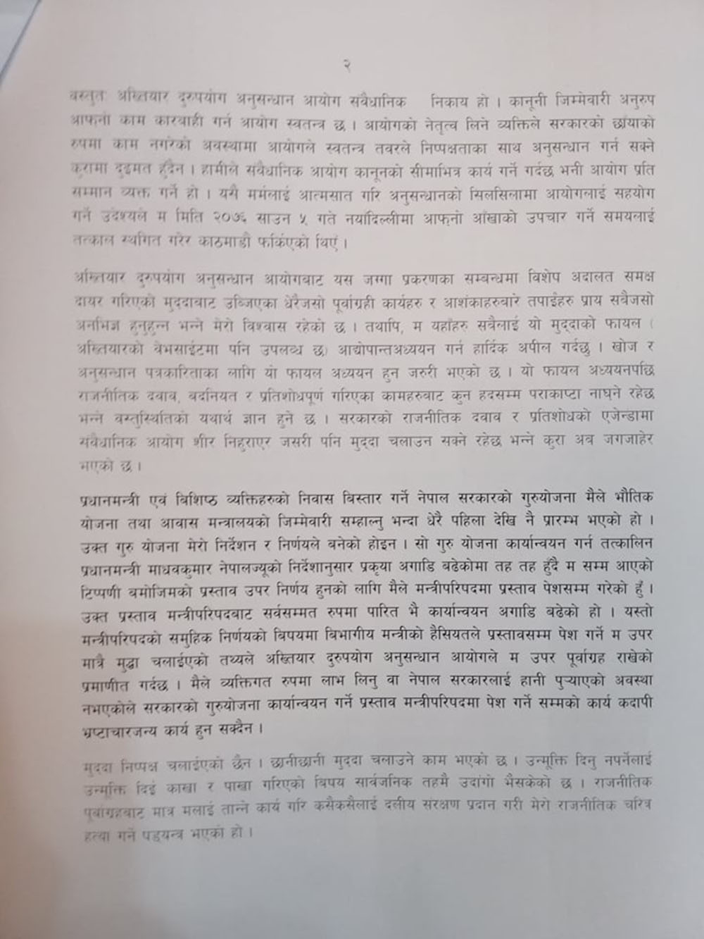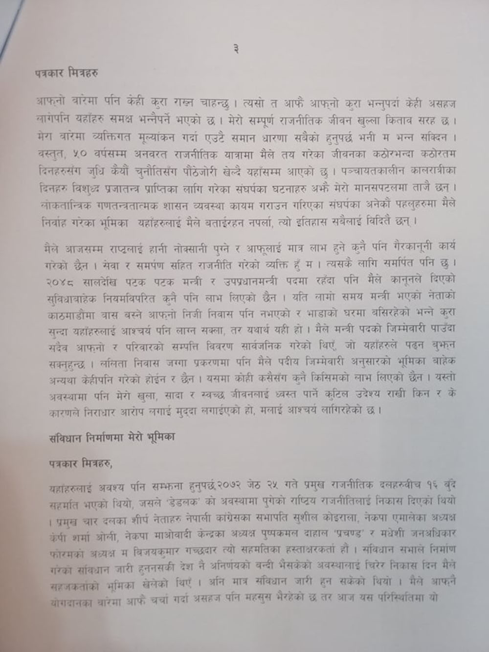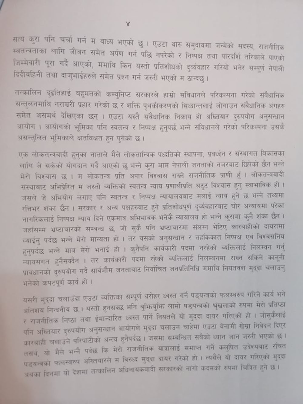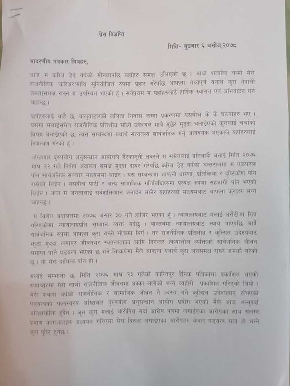 ‘अख्तियार दुरूपयोग अनुसन्धान आयोगले गैरकानूनी तबरले म समेतलाई प्रतिवादी बनाई मिति २०७६ माघ २२ गते विशेष अदालत समझ मुद्दा दायर गरेपछि करिब डेढ वर्षको अन्तरालमा कुनै पनि सार्वजनिक सञ्चार माध्यममा आईनँ। यस सम्बन्धमा आफ्नो धारणा, प्रतिक्रिया र दृष्टिकोण पनि राखेको थिईनँ। यसबीच पार्टी र अन्य सामाजिक गतिविधिहरुमा प्रत्यक्ष रुपमा सहभागी पनि भएको थिईनँ। आज म जनतालाई सर्वशक्तिमान जनार्दन मानेर यहाहरुको माध्यमबाट आफ्ना कुराहरु भन्न लागिरहेको छु’, उनले भने।