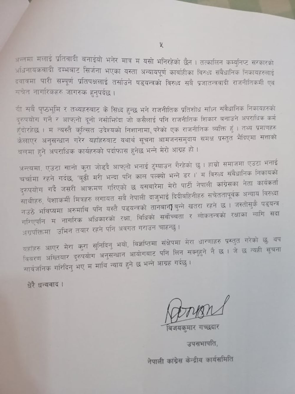 ‘म विशेष अदालतमा २०७५ असार ३० गते हाजिर भएको हुँ । न्यायालयबाट मलाई धरौटीमा रिहा गरिएकोमा न्यायालयप्रति सम्मान व्यक्त गर्दछु। वास्तवमा न्यायालयवाट न्याय पाएपछि मात्रै सार्वजनिक रुपमा आफ्ना कुरा राख्ने सोचमा थिएँ। तर राजनीतिक प्रतिशोध र कत्सित उद्देश्यबाट झुटा मुद्दा लगाएर जीवनभर स्वतन्त्रताका लागि निरन्तर क्रियाशील व्यक्तिको सार्वजनिक जीवन समाप्त पार्ने षड्यन्त्र भएको छ भने निष्कर्षमा मैले आफ्ना यथार्थ कुरा जनसमक्ष राख्ने जमर्को गरेको हुँ। यो मेरो दायित्व पनि हो।’