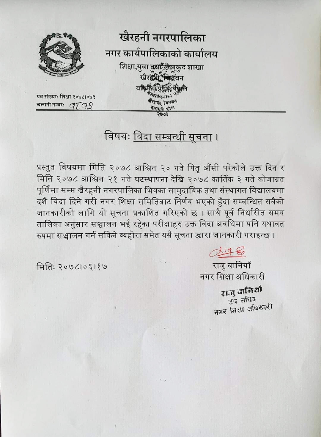 खैरहनी नगरपालिकाको शिक्षा समितिको निर्णय अनुसार नगरपालिकाभित्रका सामुदायिक र संस्थागत विद्यालयमा थारु पितृऔंसी (यमोसा पर्व) को विदा दिइएको नगर शिक्षा अधिकारी राजु बानियाँले जानकारी गराए । संस्थागत विद्यालयमा हुने आन्तरिक परीक्षा पितृऔंसीका दिन नराख्न नगर प्याब्सनलाई फोन सम्पर्क गरी निर्देशन दिइएको नगर शिक्षा अधिकारी बानियाँले बताए ।