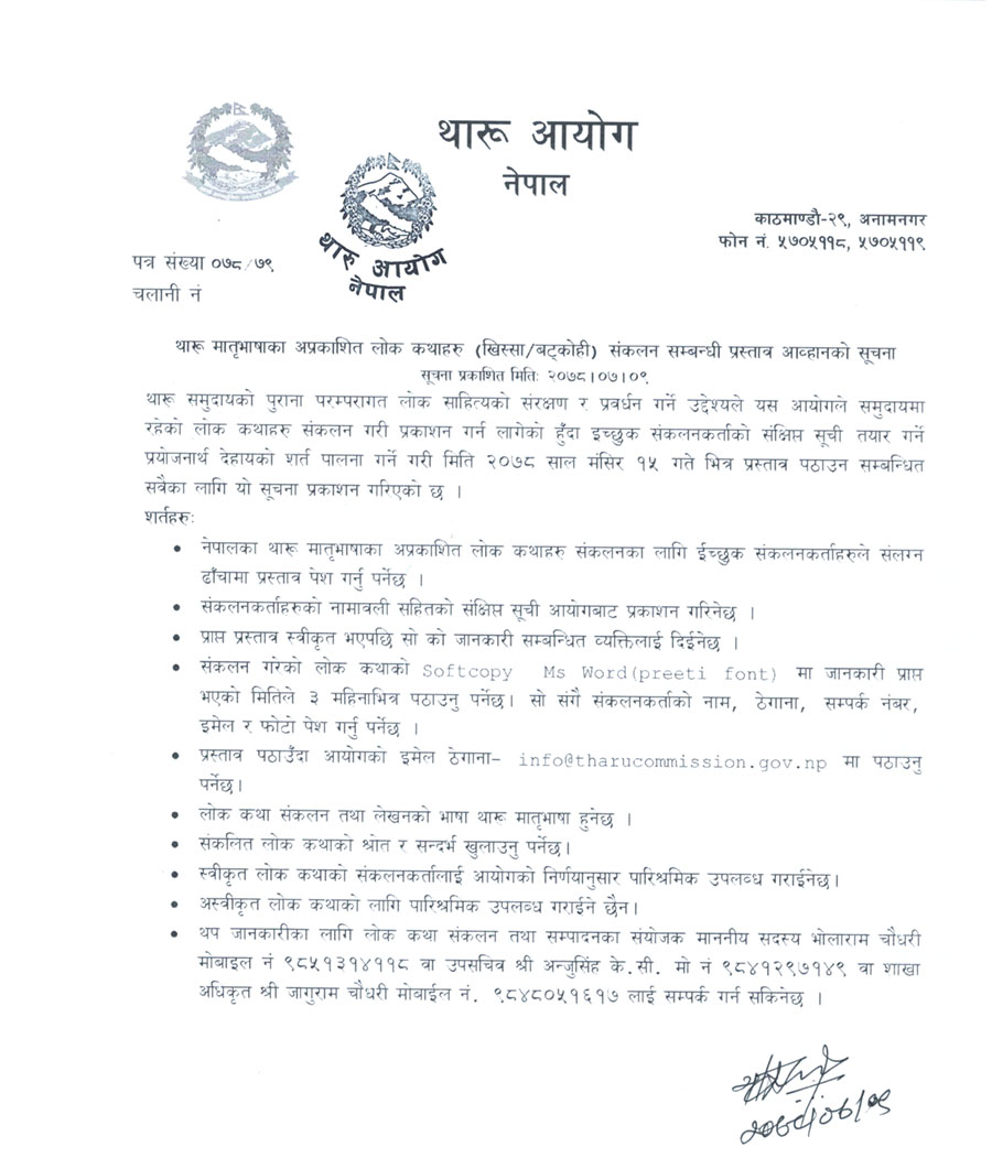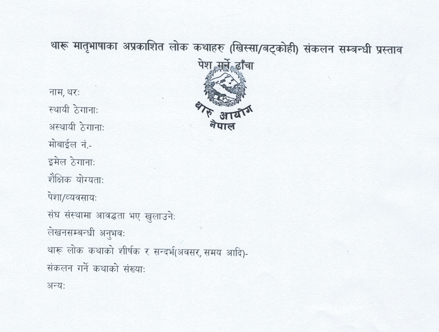 त्यस्तै आयोगले थारु मातृभाषाका अप्रकाशित लोक कथाहरु संकलन सम्बन्धि प्रस्तावनासमेत आह्वान गरेको छ। उक्त प्रस्तावना मंसिर १५ गतेभित्र पठाउन र सम्बन्धित जानकारीको लागि आयोगका सदस्य भोलाराम चौधरीलाई सम्पर्क गर्न सूचनामा उल्लेख छ।