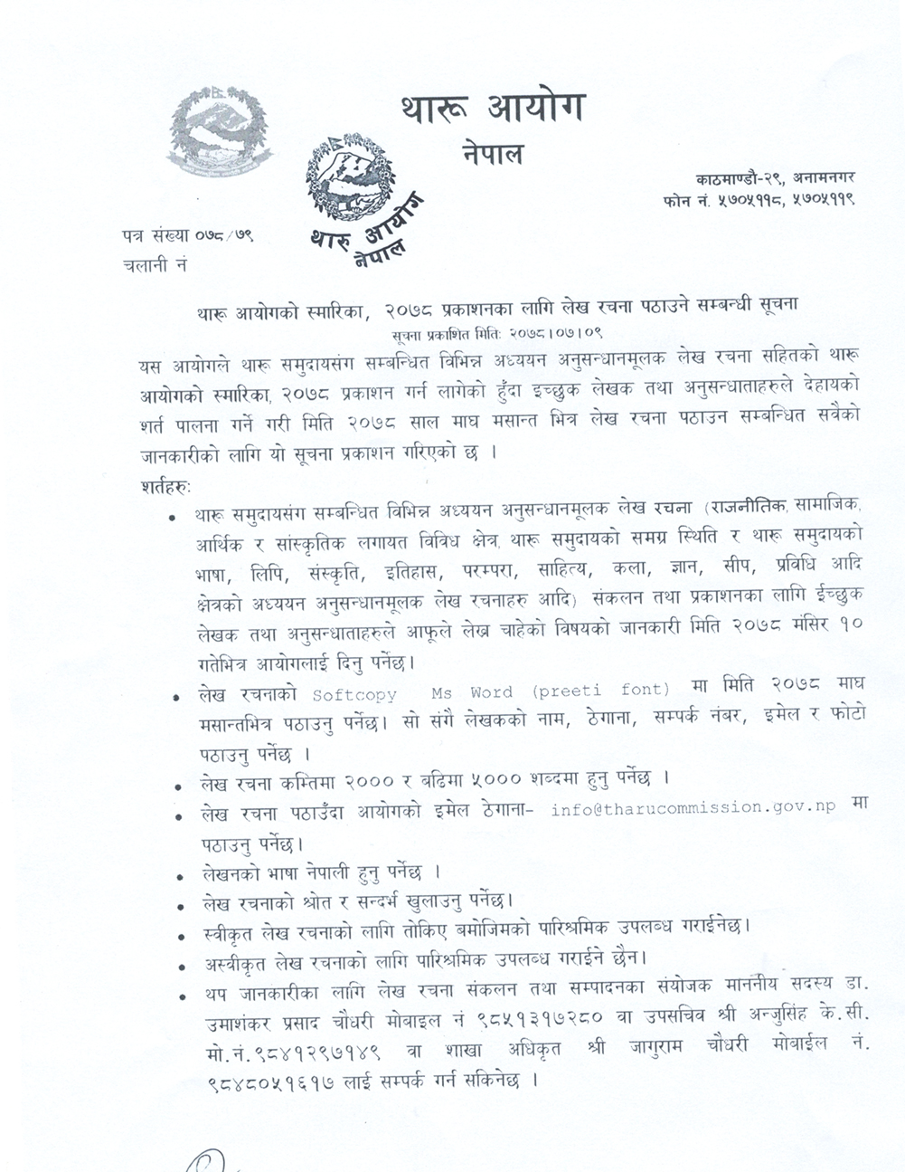 थारु आयोगले यसवर्ष स्मारिका प्रकाशन गर्दै, लेख रचना आह्वान