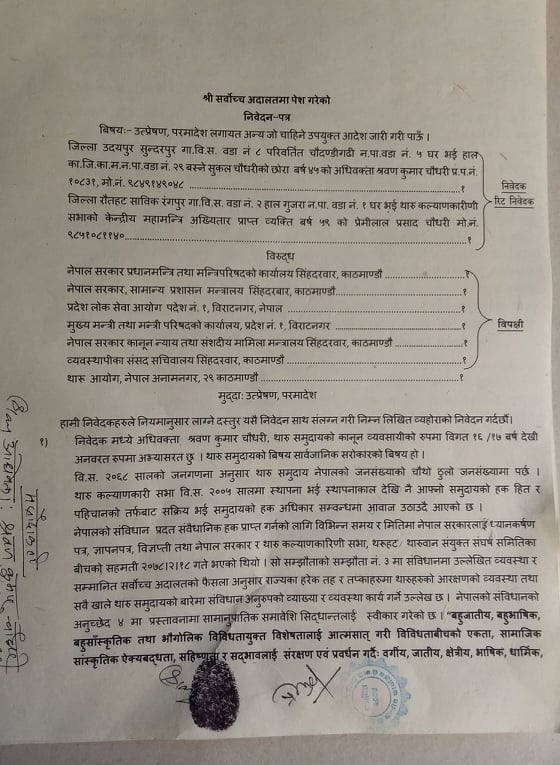 थारु आरक्षणको माग गर्दै थप चार सरकारी निकायविरुद्ध सर्वोच्चमा रिट