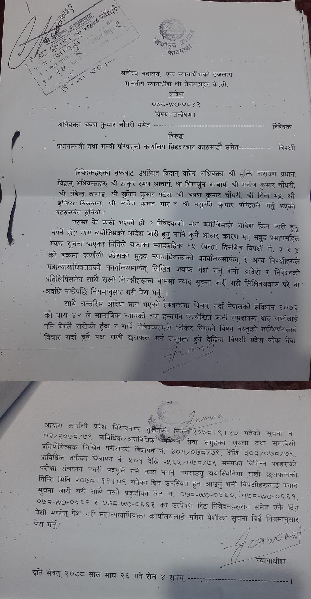 ‘अन्तरिम आआदेश माग भएको सम्बन्धमा विचार गर्दा नेपालको संविधान २०७२ को धारा ४२ ले सामाजिक न्यायको हकअन्तर्गत उल्लेखित जाति समुदायमा थारु जातिलाई पनिन बेग्लै राखेको हुँदा र साथै निवेदकहरुले जिकिर लिएको विषय वस्तुको गम्भिर्यतालाई विचार गर्दा दुवै पक्ष राखी छलफल गर्न उपयुक्त हुने देखिँदा विभिन्न पदहरुको परीक्षँ सञ्चालन नगरी पदपूर्ति गर्ने कार्य नगर्न नगराउन यथास्थितिमा राख्नू,’ आदेशमा भनिएको छ।