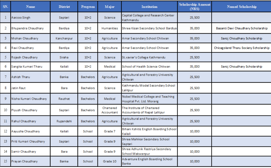 माध्यमिक तह र स्नातक तह पढ्ने विद्यार्थीहरुलाई छात्रवृत्ति प्रदान गरिएको छ। जसअनुसार कक्षा ७ पढ्ने कैलालीकी आयुसा चौधरी, कक्षा ९ पढ्ने सप्तरीकी प्रिती कुमारी चौधरी, बाराका समिर चौधरी र कक्षा १० पढ्ने बाँकेका प्रयन चौधरी रहेका छन्।