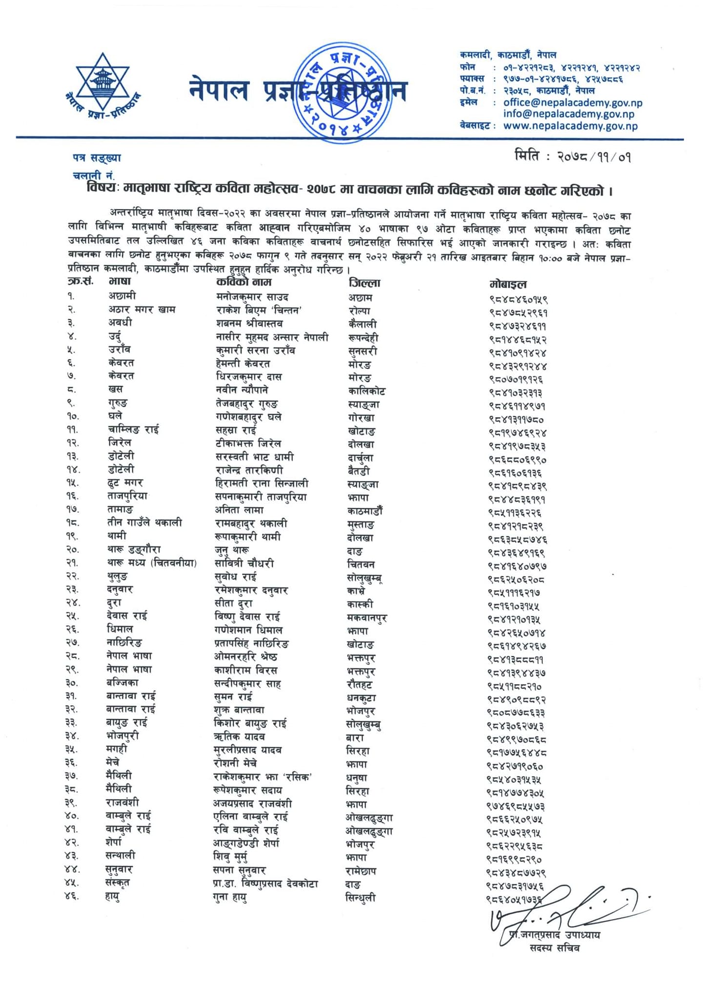प्रतिष्ठानलाई ४० भाषाका ९७ ओटा कविताहरू प्राप्त भएको थियो, त्यसमध्ये कविता छनोट उपसमितिबाट ४६ जना कविका कविताहरू छनोट भएको हो। महोत्सवका लागि प्रतिष्ठानले अछामी, अठार मगर खाम, अवधी , उर्दु, उराँव, केवरत, खस, गुरुङ, घले, चाम्लिङ राई, जिरेल, डोटेली, ढुट मगर, ताजपुरिया, तामाङ, तीन गाउँले थकाली, थामी, थारु डङ्गौरा, थारु मध्य ‘चितवनीया’, थुलुङ, दनुवार, दुरा, देवास राई, धिमाल, नाछिरिङ, नेपाल भाषा, बज्जिका, वान्तवा राई, वायुङ राई, भोजपुरी, मगही, मेचे, मैथिली, राजवंशी, वाम्बुले राई, शेर्पा, सन्थाली, सुनुवार, संस्कृत र हायु भाषाका कविता छनौट गरेको छ।