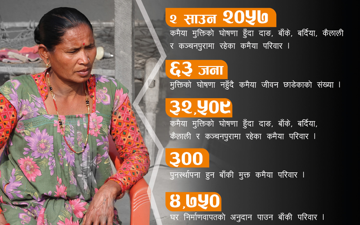 २०५७ सालमा कमैया मुक्तिको घोषणा हुँदा तत्कालीन सरकारले दाङ, बाँके, बर्दिया, कैलाली र कञ्चनपुरमा ३२ हजार ५०९ परिवार मुक्त कमैया रहेको आँकडा सार्वजनिक गरेको थियो। त्यसमध्ये कैलालीमा मात्र ८ हजार ९१० परिवार मुक्त भएका थिए। “मुक्त भएकामध्ये करीब पाँच हजार परिवारको अहिलेसम्म पुनस्र्थापना भएको छैन”, कमैया प्रथा उन्मूलन समाजकी पूर्वअध्यक्ष बसन्ती चौधरी भन्छिन्।