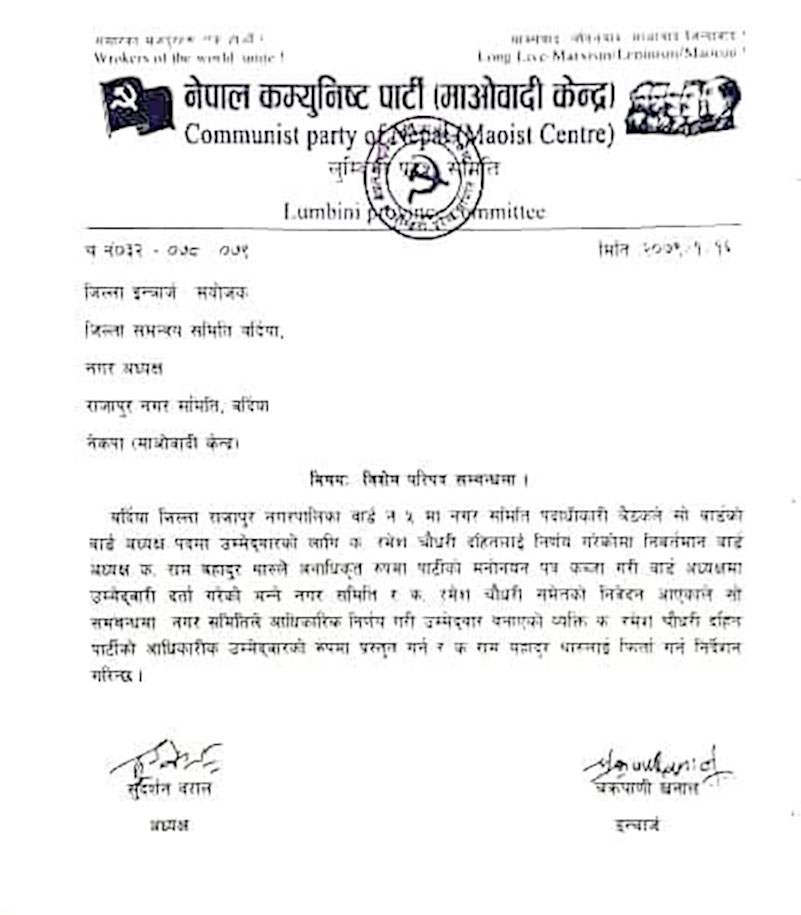बागी उम्मेदवार रहेका रामबहादुर थारुको उम्मेदवारी निर्वाचन आयोगले खारेज गरिदिएको छ। माओवादी केन्द्रको पत्रपछि निर्वाचन अधिकृतको कार्यालयले थारुको उम्मेदवारी खारेज गरेको हो।