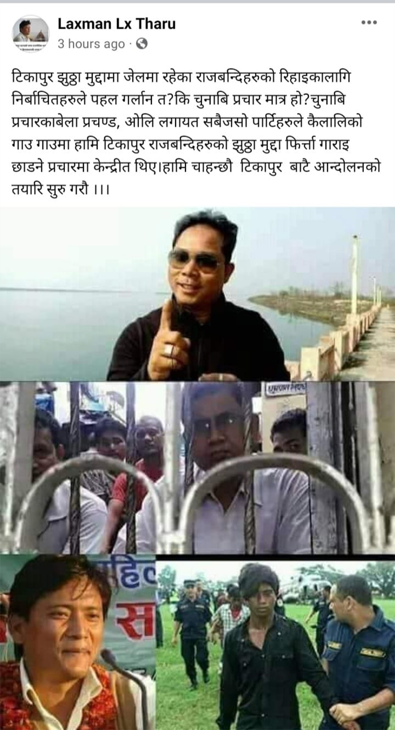 उनले टीकापुर झुठा मुद्दामा जेलमा रहेका राजबन्दीहरुको रिहाइका लागि निर्वाचितहरुले पहल गर्लान् त? भन्दै प्रशर्न गरेका छन्। उनले भनेका छन्, ‘कि चुनाबी प्रचारमात्र हो? चुनाबी प्रचारका बेला प्रचण्ड, ओलीलगायत सबैजसो पार्टीहरुले कैलालीको गाउँ-गाउँमा हामी टीकापुर राजबन्दीहरुको झुठा मुद्दा फिर्त्ता गाराइछाड्ने प्रचारमा केन्द्रीत थिए। हामी चाहन्छौं टीकापुर बाटै आन्दोलनको तयारी सुरु गरौँ।’