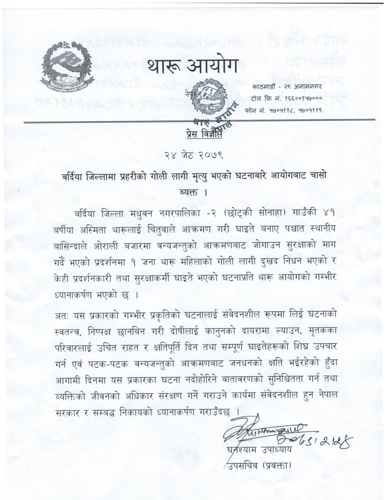 ‘बर्दियाको मधुवन नगरपालिका-२ छोट्की सोनाहा गाउँकी ४१ वर्षीया अ्समिता थारुलाई चितुवाले आक्रमण गरी घाइते बनाएपश्चात् स्थानीय बासिन्दाले ओराली बजारमा वन्यजन्तुको आक्रमणबाट जोगाउन सुरक्षाको माग गर्दै भएको प्रदर्शनमा एक जना थारु महिलाको गोली लागि दुखद निधन भएको र केही प्रदर्शनकारी तथा सुरक्षाकर्मी घाइते भएको घटनाप्रति थारु आयोगको गम्भीर ध्यानाकर्षण भएकव छ,’ विज्ञप्तिमा भनिएको छ, ‘यस प्रकारको गम्भीर प्रकृतिको घटनालाई संवेदनशीलरुपमा लिई घटनाको स्वतन्त्र, निष्पक्ष छानबिन गरी दोषीलाई कानुनको दायरामा ल्याउन, मृतकका परिवारलाई उचित राहत र क्षतिपूर्ति दिन तथा सम्पूर्ण घाइतेहरुको शिघ्र उपचार गर्न एवं पटक-पटक वन्यजन्तुको आक्रमणबाट जनधनको क्षति भइरहेको हुँदा आगामी दिनमा यस प्रकारको घटना नदोहोरिने वातावरणको सुनिश्चितता गर्न तथा व्यक्तिको जीवनको अधिकार संरक्षण गर्ने गराउने कार्यमा संवेदनशील हुन नेपाल सरकार र सम्बद्ध निकायको ध्यानाकर्षण गराउँदछ।’