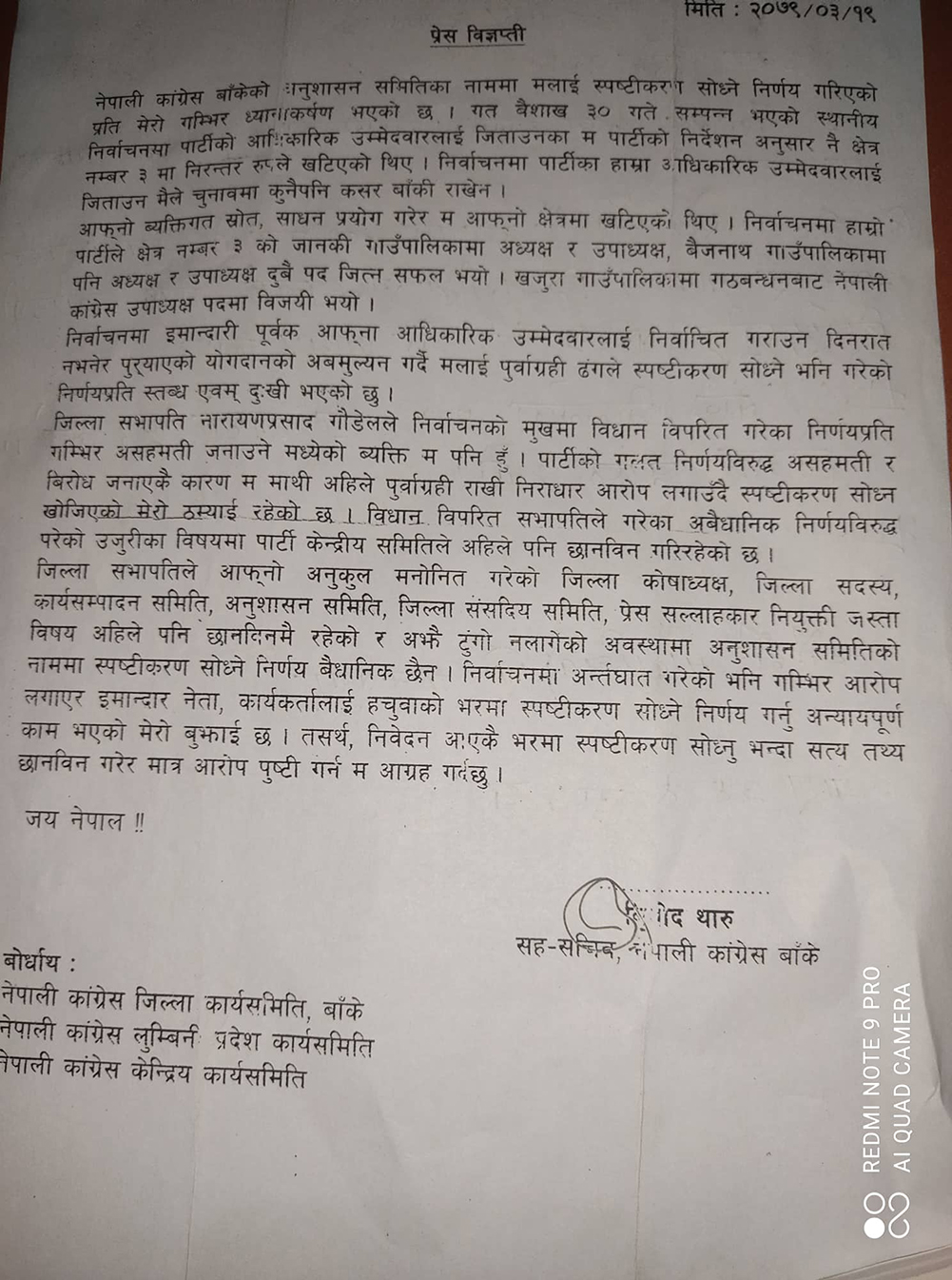 सभापतिको निर्णयमा असहमति जनाउँदा कांग्रेस बाँकेका सहसचिव विनोद थारुलाई सोधियो स्पष्टीकरण
