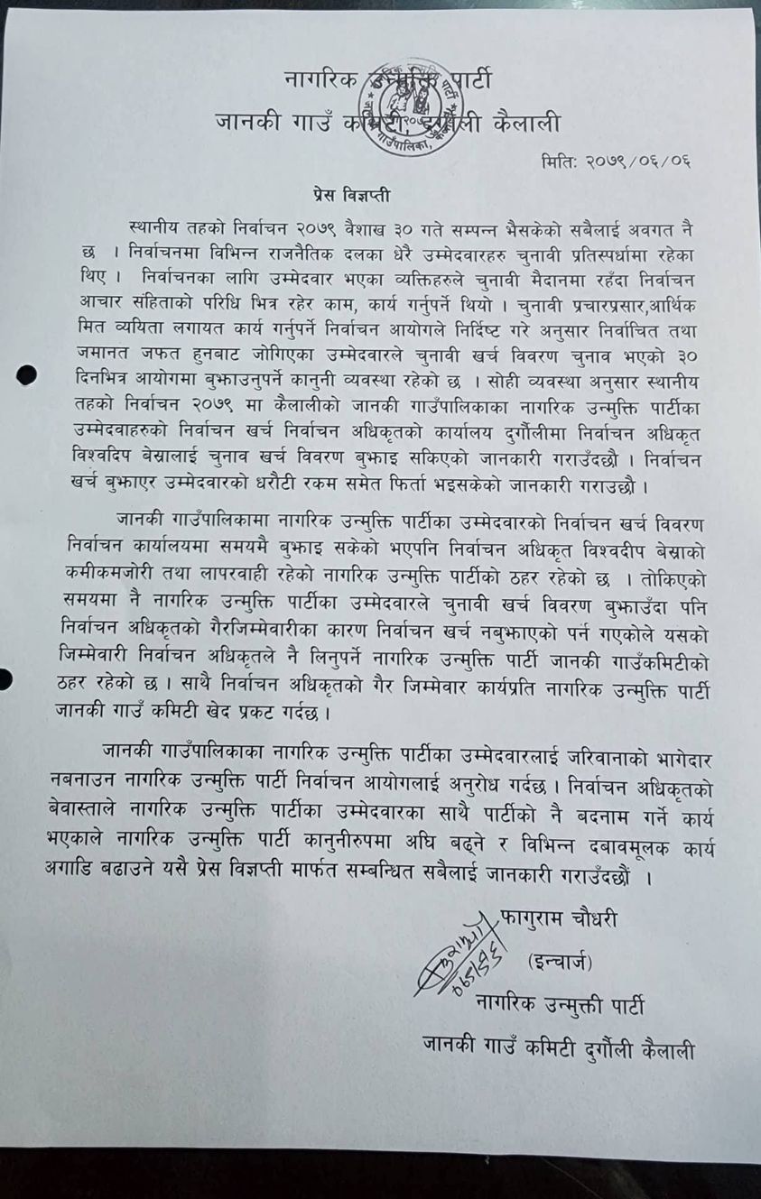 निर्वाचन अधिकृत बेस्राले लापरबाही गरेको नागरिक उन्मुक्तिले ठहर गरेको छ। ‘तोकिएको समयमै पार्टीका उम्मेदवारले चुनावी खर्च विवरण बुझाउँदा पनि निर्वाचन अधिकृतको गैरजिम्मेवारीका कारण निर्वाचन खर्चन नबुझाएको पर्न गएकाले यसको जिम्मेवारी निर्वाचन अधिकृतले ने लिनुपर्ने पार्टीको ठहर छ। निर्वाचन अधिकृतको गैरजिम्मेवारीप्रति जानकी गाउँ कमिटी खेद प्रकट गर्दछ,’ विज्ञप्तिमा भनिएको छ।