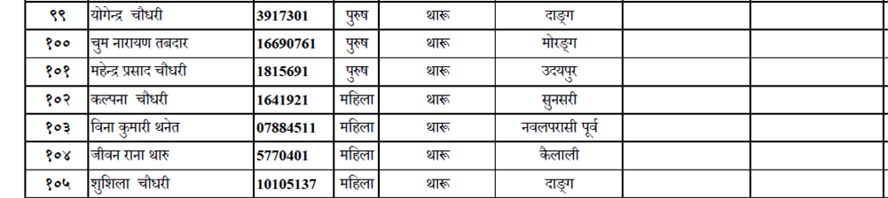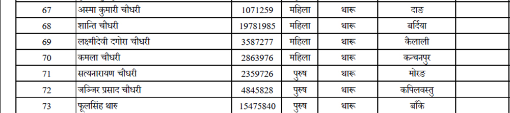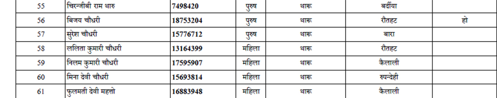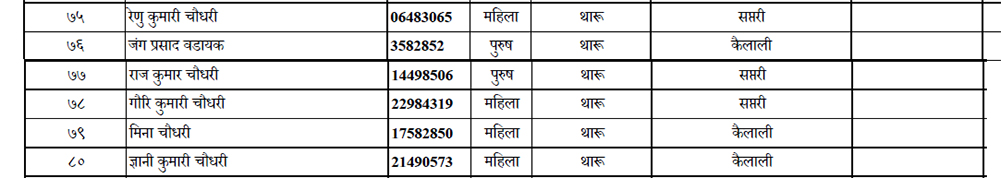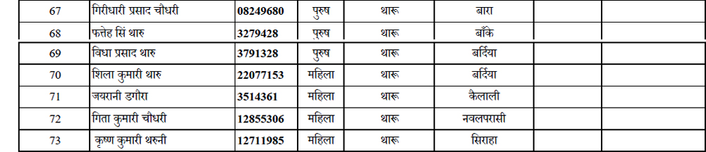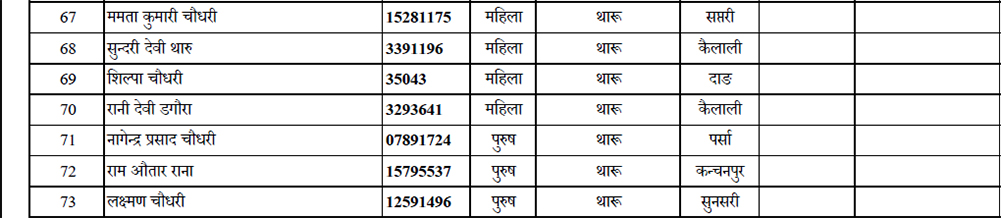 त्यस्तै राष्ट्रिय प्रजातन्त्र पार्टीले थारु कोटाको पहिलो नम्बमार गिरधारीप्रसाद चौधरी र महिलामा शिलाकुमारी थारुलाई राखेको छ।