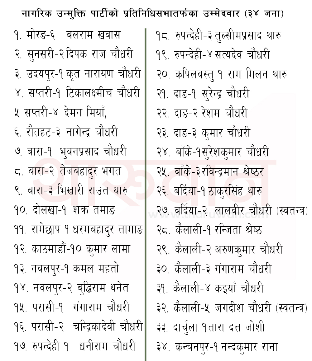 नागरिक उन्मुक्ति पार्टीबाट यी हुन् प्रतिनिधिसभाका ३४ जना उम्मेदवार (सूचीसहित)