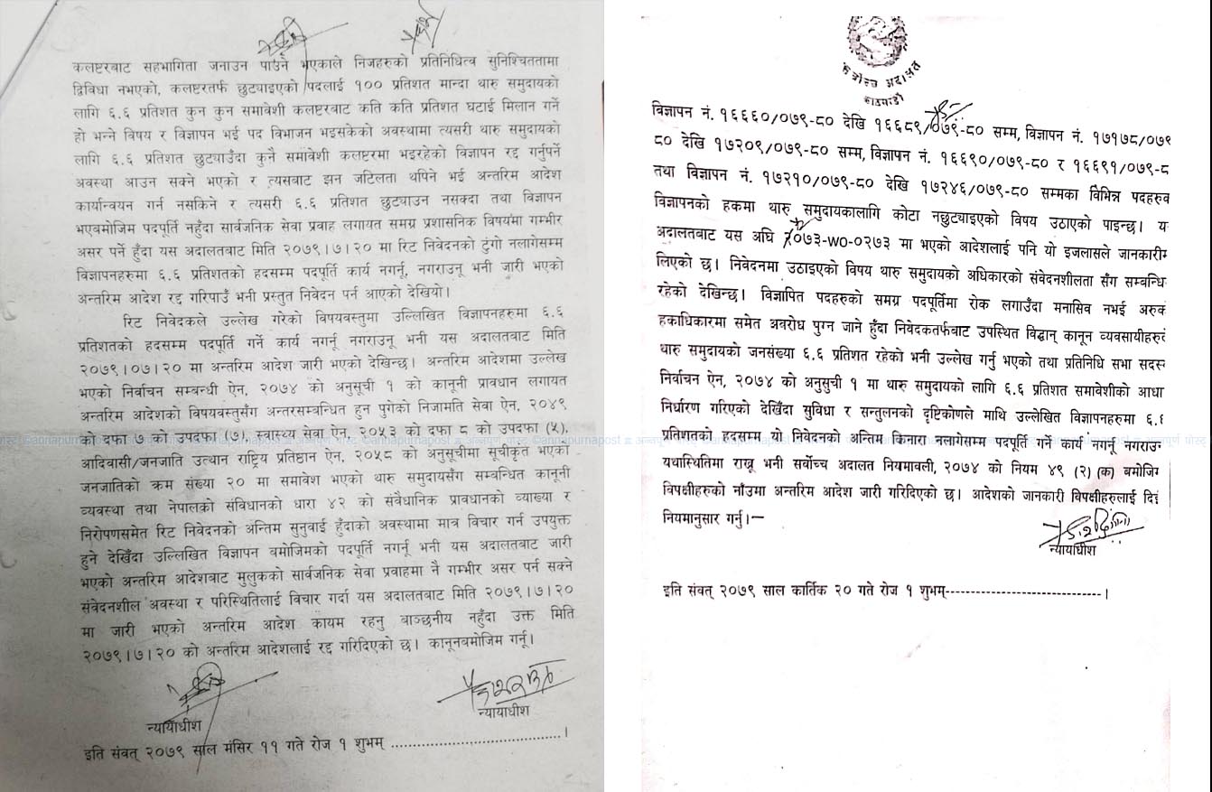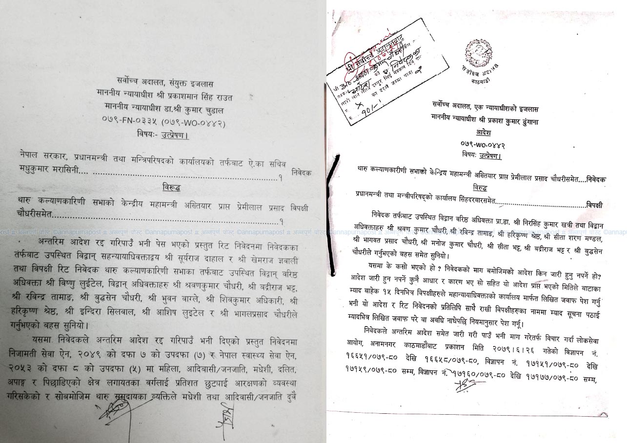 थारूका नाममा जारी भएका अन्तरिम आदेश (बाँया) र रद्द गरिएको अन्तरिम आदेश