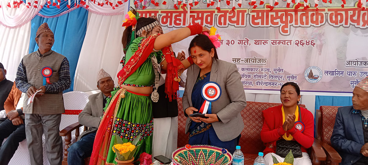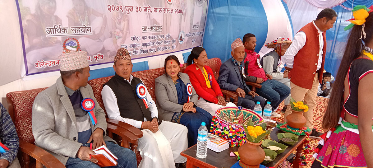 कार्यक्रमका प्रमुख अतिथि एवम् सुर्खेत वीरन्द्रनगर नगरपालिकाका नगरप्रमुख मोहनमाया ढकालले नेपाल विविधतामा एकता भएको देश हो । थारु समुदाय नेपालको मात्र होइन सुर्खेत उपत्यकाको पनि मूल आदिवासी हुन् । थारुहरुको ऐतिहासिक चाड माघीमा सबै गाउँबाट जम्मा भएर मनाउने कामले संस्कृति संरक्षणमा महत्वपूर्ण योगदान पुग्ने बताइन् । यस्तो रचनात्मक कार्यक्रमले पनि थारु संस्कृति संरक्षणमा टेवा पुग्ने भएकाले यसलाई अझै व्यापक र बृहत गर्दै जानुपर्ने बताइन् । संस्कृति देशको पहिचान र चिनारी भएकोले थारु समुदायका लागि नगरपालिकाबाट हुने सबै किमिसको सहयोग हुने कुरा व्यक्त गरिन् ।