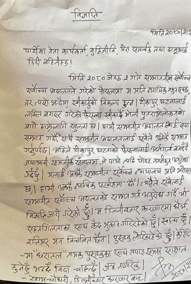 न्यायालयप्रति आफ्नो भरोसा रहेको भन्दै उनले फैसलालाई लिएर अनर्गल प्रचार नगर्न सबैलाई आग्रह गरेका छन्। ‘सबैलाई सम्मानीत सर्वोच्च अदालतको सम्मान गर्न अनुरोध गर्दै यो विज्ञप्ति जारी गरेको छु,’ डिल्लीबजार कारागारमा धैर्य र सहनशीलताका साथ कैद भुक्तान गरिरहेको भन्दै उनले भनेका छन्, ‘स्वस्थ छु, रत्तिभर मन विचलित भएको छैन ।’